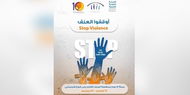 The Syria Trust for Development has called on all segments of society to unite together and participate in efforts to stop gender-based violence. “For the seventh year in a row, the Syria Trust for Development calls all members of the society including men and women, youth and adolescents, to unite together and participate in mobilized efforts to stop gender-based violence” the Syria Trust for Development said on Saturday on its facebook page.