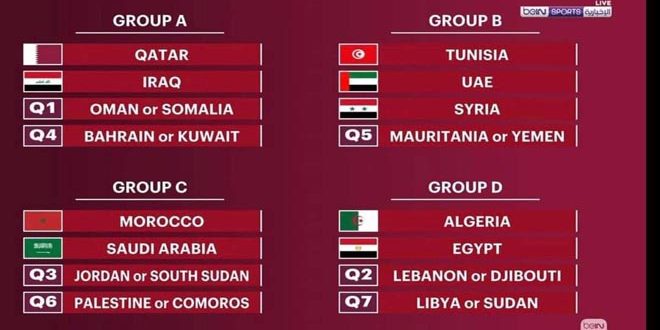 The first group includes both Qatar, Iraq, the winner of the match between Oman and Somalia and the winner of the match between Bahrain and Kuwait, while the second group includes our team, Tunisia, UAE, and the winner of the match between Mauritania and Yemen. The third group includes Morocco and Saudi Arabia, the winner of the match between Jordan and South Sudan and the winner of the match between Palestine and Comoros. And finally, the fourth group includes Algeria and Egypt, the winner of the match between Lebanon-Djibouti and the winner of the match between Libya-Sudan match.