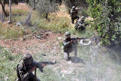 Another clash raged today when terrorists tried to sneak from al-Waer orchards into al-Qarabis quarter.