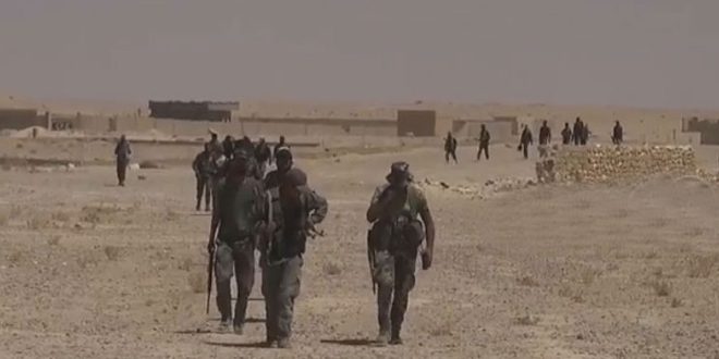 Provinces – A military source said that Syrian Arab Army units, in cooperation with supporting forces, completed the first stage of its operations with the convergence of forces operating in Raqqa’s southwestern countryside, Hama’s eastern countryside, and Homs’ eastern countryside, fully encircling the remaining ISIS terrorists in Uqayrbat area, SANA reported.