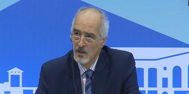 Al-Jaafari talked about the US and Israeli support for the terrorists in Syria, referring to the scandal represented in Israel’s providing protection for the terrorists of the White Helmets and smuggling them to Europe. Likewise, he said, the terrorists who attacked Sweida and committed a massacre there came from al-Tanf area where US troops are illegally deployed.