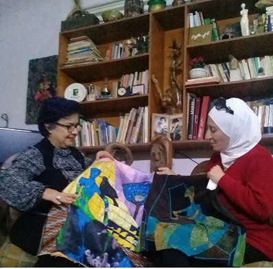 “ As a Syrian artist I am very proud that my fabric art works are turned into scarves which will be distributed all over the world to address a message to the world that Syrians are still able to spread the energy of joy, hope, life at the world level despite the unjust blockade imposed on our country” She expressed.