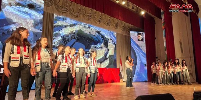 Syrian children, during a Syrian-Belarusian Friendship Evening, present artistic shows expressing Syria’s history and civilization