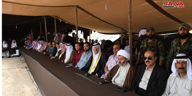 ALEPPO– Representatives of Syrian clans organized on Saturday a public gathering in Deir Hafer area in the eastern countryside of Aleppo province, in order to express rejection of foreign interference in Syrian affairs, SANA reported.