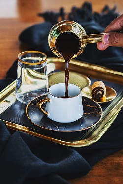 Syrian coffee is a rich, strong simmered brew that is typified by a froth on top and a sediment of smooth, fine grounds settled on the bottom of the cup.