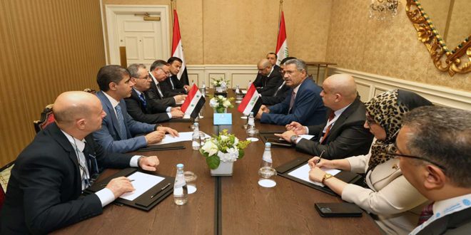Doha (ST) – The Minister of Oil and Mineral Resources, Dr. Firas Qaddour, met with the Iraqi Deputy Prime Minister for Energy Affairs, Hayan Abdul Ghani Al-Sawad, on the sidelines of the 12th Arab Energy Conference in Doha.