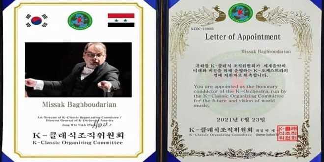 Maestro Baghboudarian said in a statement to SANA that orchestra conductors who have been granted the honorary conductors will be invited to South Korea in 2023 after the end of the global “Covid- 19” epidemic crisis, to be briefed on the reality of music in South Korea, conduct concerts, hold workshops and exchange programs between Orchestra conductors as well as participation in international competition committees.