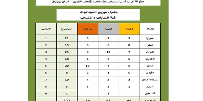 Our team came first in the medals table, winning 9 gold, 7 silver and 5 bronze medals, ahead of Qatar, which came second with 8 gold, 6 silver and 5 bronze medals, while Iraq came third with 7 gold, 12 silver and 6 bronze medals.