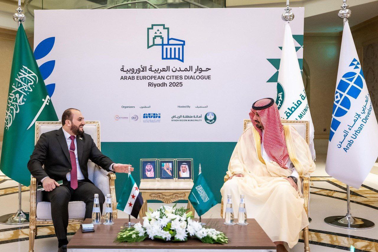 The governor of Damascus, Maher Marwan, met His Highness the Secretary of Riyadh Region,” Prince Dr. Faisal bin Abdulaziz bin Ayaf”, president of the Arab Institute for City Development and Chairman of the Steering Committee of the Forum, on the sidelines of the Arab-European Cities Dialogue Forum AECD 2025.