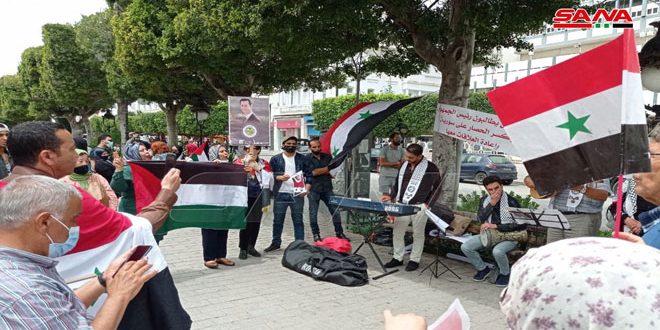 The participants in the event raised the Syrian and Tunisian national flags, calling for restoring relations with Syria and breaking the unjust siege imposed on it, pointing out that Syria is the first line of defence for Arab sovereignty and dignity.