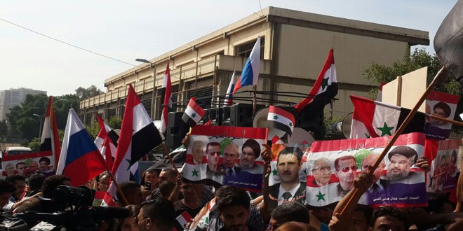 The participants carried pictures of Presidents Bashar Al-Assad and Vladimir Putin in addition to placards on which phrases expressing appreciation for the Russian supportive stances towards Syria in the confrontation of terrorism were written.