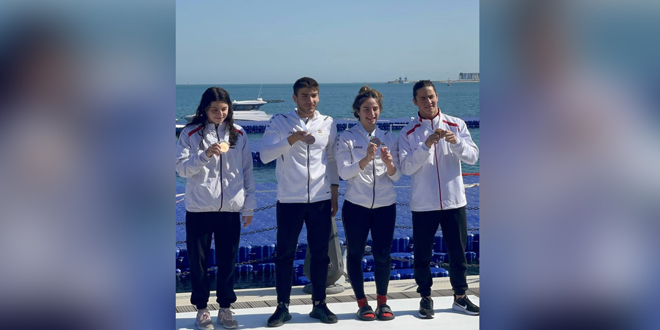 Doha, (ST) – The Syrian swimming team on Monday rose its medal tally to 12 in the Arab Championship held in Qatar after winning a bronze medal in the open water relay race. The Syrian swimmers, who won this medal are: “Kenan Al-Gharib, Inana Suleiman, Alma Hamad, and Osama Trabelsi.