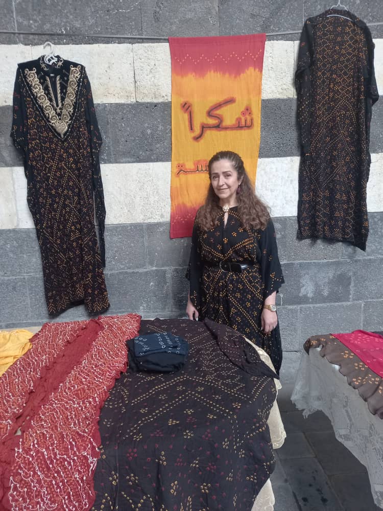 “The course was held from 17 to 27 May in 2022 in Damascus, and 12 trainees took part in it….The works of hajja (elderly lady, referring to Mrs. Shamsa Bilal) and trainees: shawls, robes and cotton towels,  were displayed in an exhibition held on the 28th  of May…. Several visitors, who came from Lebanon, bought some of these handmade works. I bought a robe made by hajja because I consider it as a piece of art that reflects the heritage of Syria… There are other robes for sale and the price of one piece is 4 million Syrian Pounds,” she said.