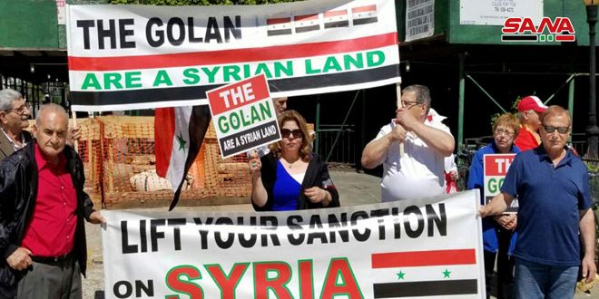 NEW YORK- A number of Syrian expatriates in the US gathered in front of the UN headquarters in New York in condemnation of the US President Donald Trump’s proclamation on the occupied Syrian Golan.