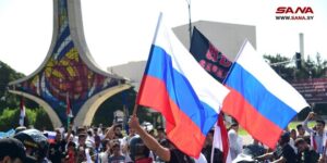 Sharing with the Russian people their celebration on the “Russian Flag Day ”, hundreds of Syrians gathered at Al-Omaweyeen Square in Damascus to take part in a festivity during which a big Russian flag as well as tens of Syrian and Russian flags were raised.