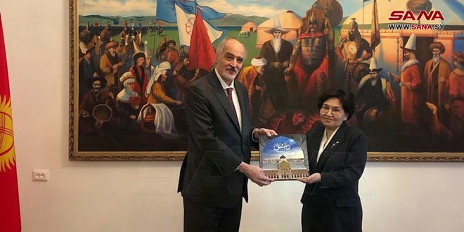 During the meeting, Al-Jaafari gave a political and economic preview on the course of the terrorist war that Syria has been exposed to, and on the negative impacts of the unilateral coercive Western measures on the Syrian people, noting Kyrgyzstan’s balanced and supportive stances towards Syria at international forums.