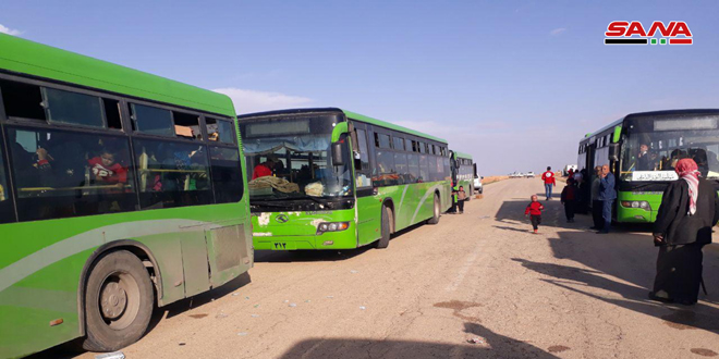 SANA reporter said that several buses, provided by the Syrian government, transferred Sunday noon tens of families from al-Rukban camp through Jleigim corridor in the Syrian Badia (desert) to makeshift centers in Homs in preparation to transfer them to their original places of residence in areas liberated from terrorism by the Syrian Arab army.