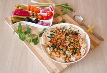 Serve fatteh with tomatoes, onions, spring onions, radishes, picked cucumber,