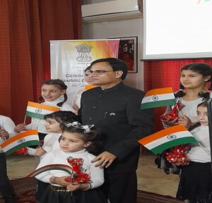 Ambassador Dr. Irshad Ahmad offered floral tributes to the bust of Mahatma Gandhi. He then unfurled the national flag. This was followed by the singing of the Indian national anthem. Then Ambassador Dr.Irshad Ahmad read the Indian President’s message on the eve of the 75th Republic Day.