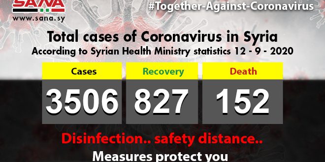 The Ministry of Health announced in a statement that the number of infections recorded in Syria so far has reached 3506, of which 827 have recovered and 152 died, after 30 new infections were recorded, 15 recovered, and 3 deaths recorded from the virus.