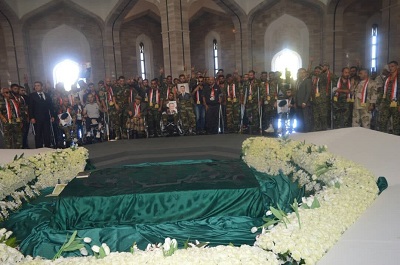 The members of the association and more than 100 wounded were received by the director of the mausoleum and tourism director in Lattakia, Mr. Ammar Saqr, where they laid a wreath of flowers on the tomb and read al-Fatihah for the blessed spirit of the immortal leader .