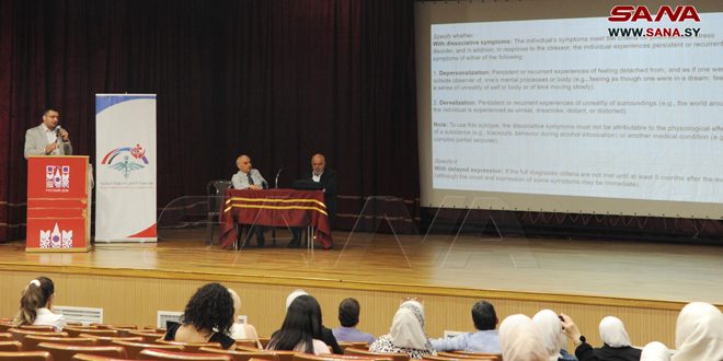 Dr. Amer Al-Hajj, a specialist in psychiatry, presented a lecture on (post-traumatic stress disorder), whose cases are common during wars and natural disasters such as earthquakes, indicating that its prevalence rate can reach 13 percent in men or males after exposure to these events, and it can reach 30 percent in women,pointing out that this disorder is very important and must be identified and the patient must be exposed to its diagnosis mechanism and methods of pharmacological and psychological treatment, noting that the Russian side had a major role in diagnosing this disorder after World War II.