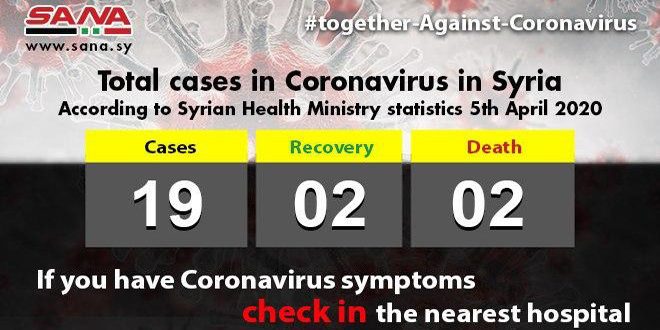 The Ministry of Health declared three new persons infected with coronavirus in Syria. The number of patients in the country has increased to 19, two of them have recovered, and two died