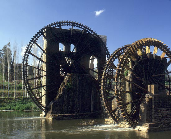 The Norias of Hama are a number of norias (“wheels of pots”) along the Orontes River in the city of Hama, Syria. Only seventeen of the original norias remain. They are mostly unused now and serve an aesthetic purpose. They were called “the most splendid norias ever constructed.” The norias of Hama were submitted as a tentative World Heritage Site by the Syrian Arab Republic in June 1999.