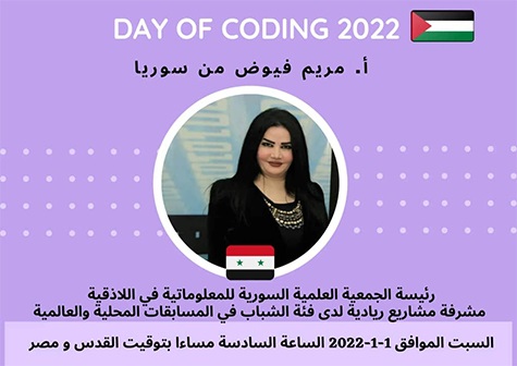 A remarkable participation was achieved by Syria represented by the Syrian Computer Society ( SCS) Lattakia branch in theGlobal Coding Award Day event organized by the Ministry of Education in Palestine.