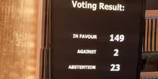 149 countries voted in favor of the resolution entitled “The Occupied Syrian Golan” against the occupation entity and the United States, while 23 countries abstained.