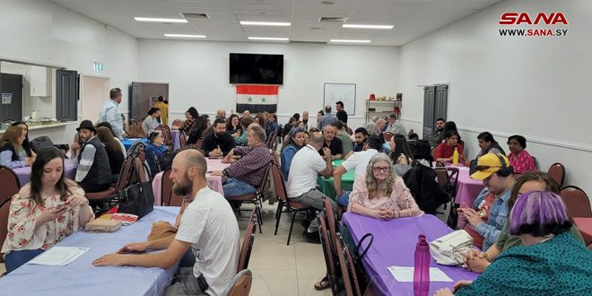 The women of the association presented the Australian visitors with traditional Syrian food and sweets while the Syrian player Hussam Karam and the young singer Nour Jeries presented the most beautiful Syrian songs, national anthems, Al-Qudud Al-Halabi and Muwashahat.