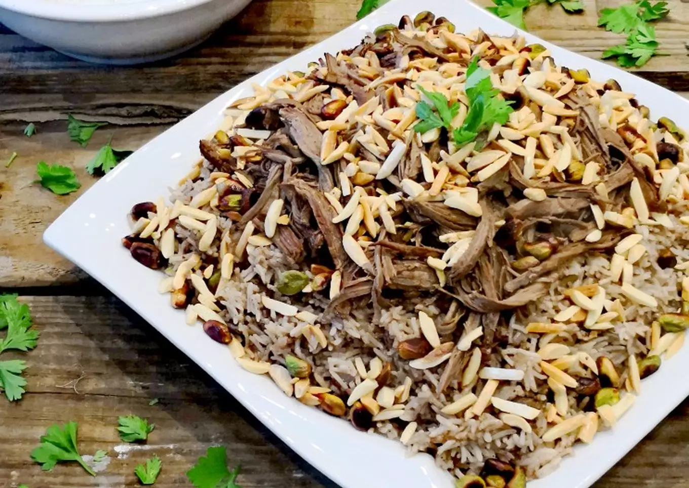 Spread Hashweh over the platter, cover with the chicken and garnish with the nuts. Serve immediately with some yoghurt on the side.