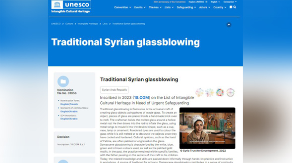 The United Nations Educational, Scientific and Cultural Organization (UNESCO) announced on Tuesday the inclusion of Syrian traditional glass blowing craft on the list of Intangible Heritage in Need of Urgent Safeguarding within the lists of human cultural heritage.