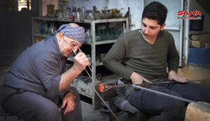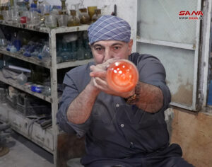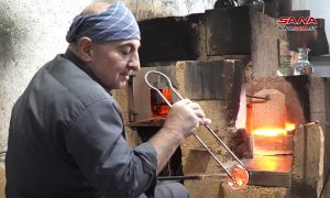 The organization added that traditional glass blowing in Damascus is an authentic craft of making glass materials using pieces of leftover glas. To create new objects , pieces of glass are placed inside a hand-made brick oven until they are melted. The craftsman twists the molten glass around a hollow metal rod . Then he blows into the rod to inflate the glass , using metal tongs to shape it into the desired shape, such as a cup, vase, lamp, or piece of decoration.Powdered dyes are used to color the glass while it is still melted to decorate objects once they have cooled and hardened. Cultural symbols are often drawn or engraved on the glass. Damascus glassblowing is characterized by the colors used including , white, blue, green, and crimson, in addition to gold-plated motifs.