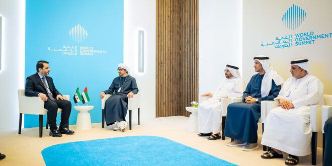 The Emirates News Agency (WAM) reported Abdullah bin Zayed as saying during his meeting with the Minister of Foreign Affairs and Expatriates Asaad Al-Shibani, on the sidelines of the World Government Summit 2025 in Dubai: “The UAE stands by the brotherly Syrian people and supports all efforts that lead to fulfilling their aspirations for sustainable security, stability and decent life.”