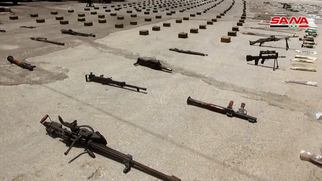 A source at the special authorities was quoted by the Syrian News Agency (SANA) as saying: ” During a combing operation in the areas that were liberated from terrorist groups by the Syrian army in the southern region to secure the return of civilians to their homes, and in cooperation with honest people, we found a big quantity of weapons and ammunition hidden inside one of the hideouts of terrorists before defeating them.”