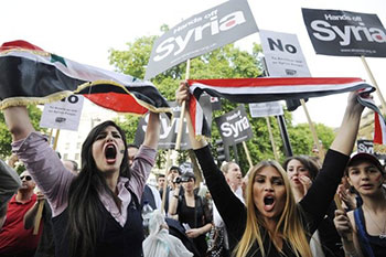 “US, NATO, hands off Syria,” chanted hundreds of protesters, weaving through thousands of tourists, some carrying pictures of President Bashar Al-Assad, and some just declaring themselves against another US war.