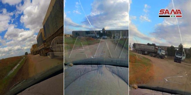 On Thursday, the occupation forces brought out a convoy of 18 trucks carrying stolen Syrian wheat to the northern part of Iraq through Simalka border crossing in the city of Al-Malkiyeh in Hasakah countryside.