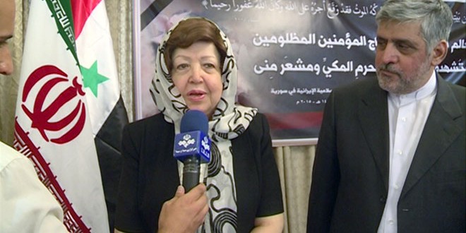 DAMASCUS – Vice President, Dr. Najah al-Attar, offered on Thursday condolences on the Iranian pilgrims who have passed away in the catastrophe of Mina, Mecca.