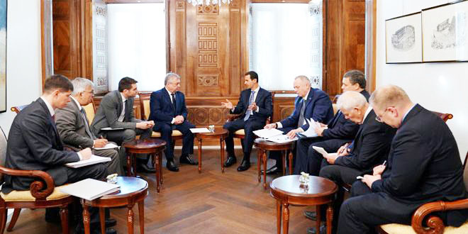 President Al-Assad, during his meeting on Thursday with the Russian President’s Special Envoy for Syria, Alexander Lavrentiev and the accompanying delegation, added that theses victories enhance efforts as to find peaceful solution that restores stability to Syria.