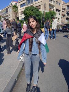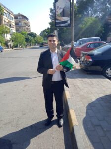 Young Mohamed Namoura holding a Palestinian flag told us that he is participating in today’s solidarity stand to show his support and solidarity with the people of Palestine especially in Gaza city , telling them that we here in are Syria praying for their victory and protection and to finally end the occupation on their lands.