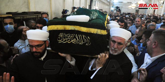Damascus (ST): With the participation of the representative of President Bashar al-Assad, the Minister of Religious Endowments Dr. Mohammad Abdel Sattar al-Sayyed, the funeral prayer of martyr sheikh Mohammad Adnan al-Afyouni took place at the Umayyad Mosque in Damascus.