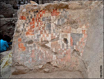 Rectangles dominate the ancient painting, which formed part of an adobe circular wall of a large house with a wooden roof. The site has been excavated since the early 1990s.