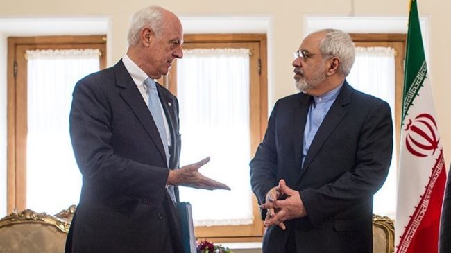Iranian Foreign Minister Mohammad Javad Zarif held a meeting on Monday with UN Special Envoy to Syria Staffan de Mistura on the sidelines of the 2015 Review Conference of the Parties to the Treaty on the Non-Proliferation of Nuclear Weapons (NPT) in New York, during which the UN official highlighted Iran’s role in resolving the ongoing crisis in Syria.