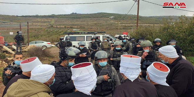 People in the occupied Syrian Golan massed themselves in the roads leading to their farmlands to protest against the Israeli occupation authorities’ plan to build giant turbines in the occupied towns of Majdal Shams, Sheita, Baq’ata and Mas’ada, SANA reporter in Quneitra said, citing a source from the occupied Golan.